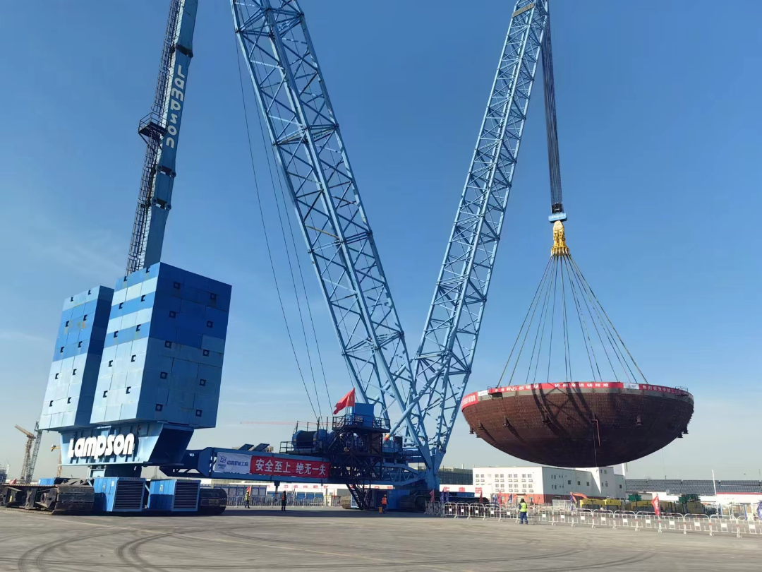 2024年1月,徐大堡核電1號機組CV底封頭開始吊裝,CV底封頭整體呈半橢球形殼體結(jié)構(gòu),具有重量大、體積大、就位精度高等特點。巨力索具所提供的轉(zhuǎn)接頭、分配器、吊索組成成套吊具解決受力問題,并全程配合吊裝過程,確保吊裝過程穩(wěn)步進行。