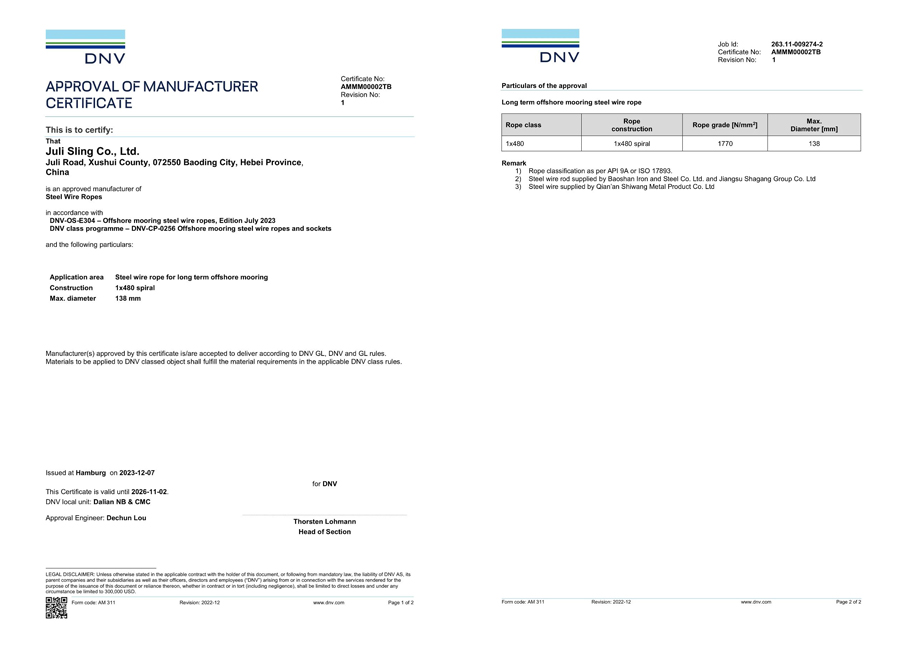 2020年11月,巨力索具取得了永久系泊用單股涂塑鋼絲繩的DNV·GL工廠認(rèn)可證書(shū),成為國(guó)內(nèi)首家通過(guò)該類(lèi)鋼絲繩DNV·GL工廠認(rèn)可的廠家。