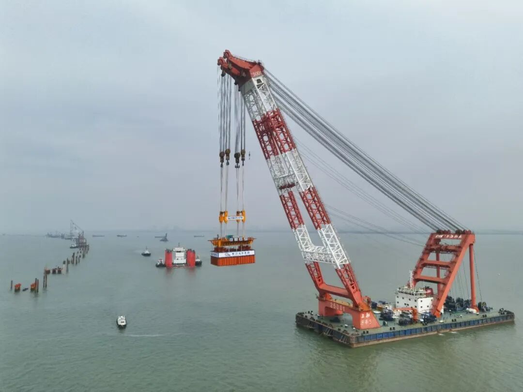 此次完成吊裝的預制墩臺體型巨大,長15.3米、寬11.6米、高4.5米,總重量相當于460輛標準貨車的載重總量。