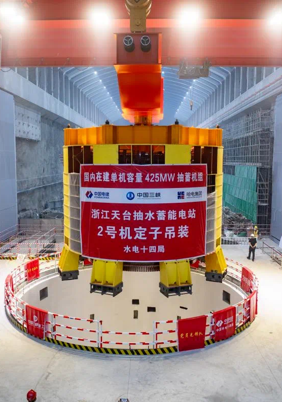 世界最高水頭抽蓄電站——浙江天臺(tái)抽水蓄能電站2號(hào)機(jī)組定子就位工作,巨力索具為其定制了配置八組起吊桿的定子吊具,確保其能夠承受巨大拉力和沖擊力。